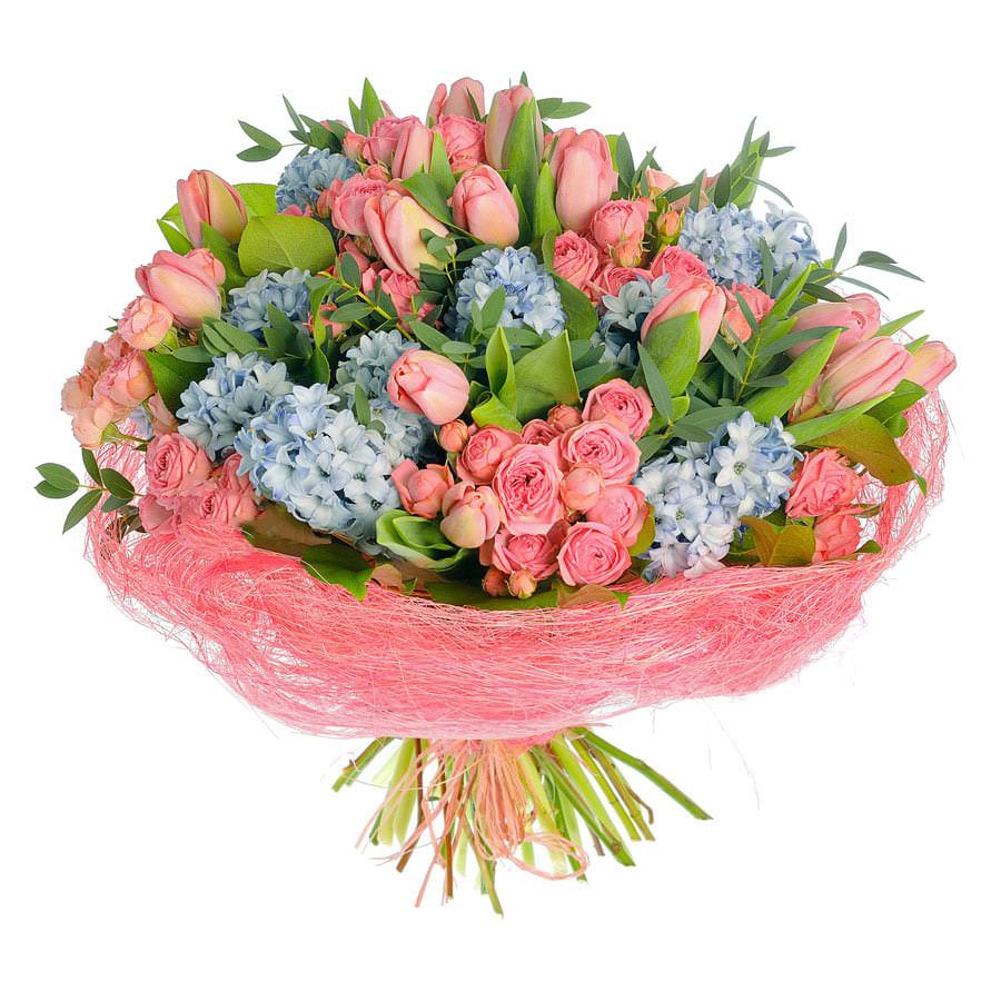 Гиацинт, роза кустовая, тюльпаны, зелень.